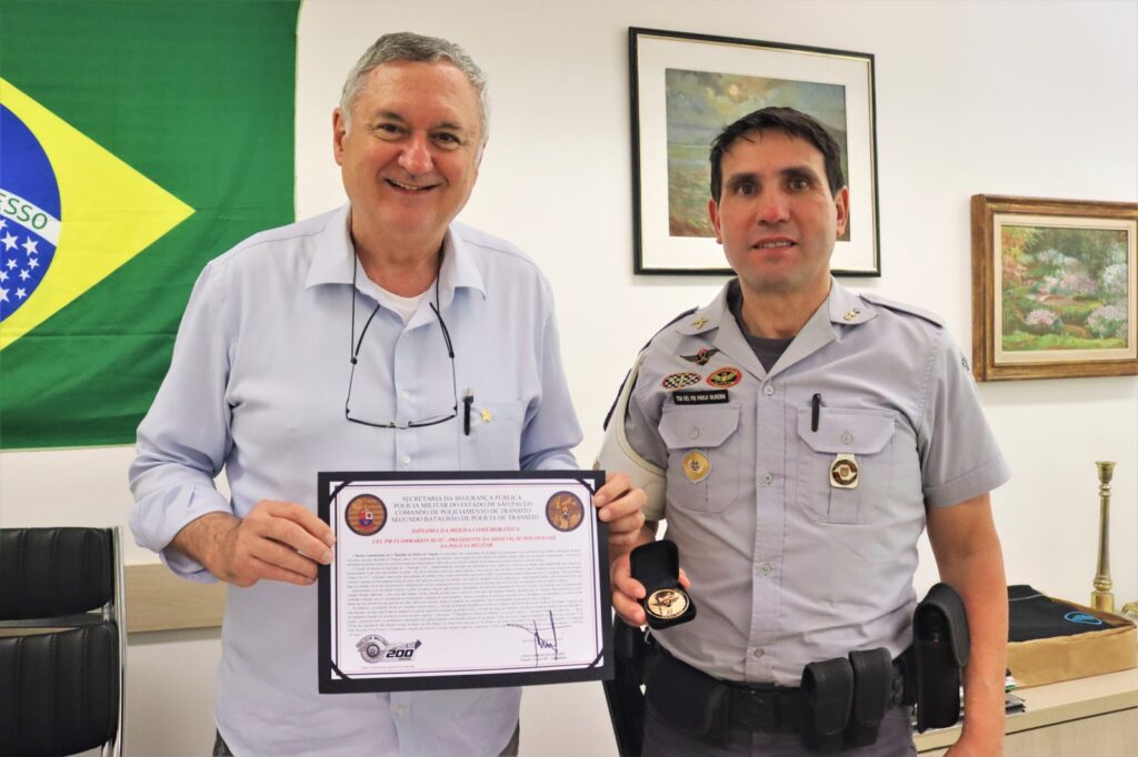 Recebemos hoje, dia 17 de agosto, a visita do Ten Cel PM Paulo Oliveira, Comandante do 2º batalhão de Polícia de Trânsito. Durante o encontro, o presidente da AOPM, Cel PM Flammarion Ruiz foi homenageado com a medalha ”Challenge Coins” e diploma da moeda comemorativa.