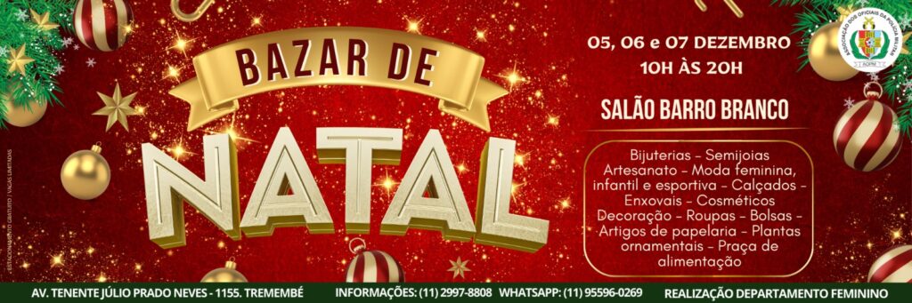 Aberto a sócios e não sócios da Associação dos Oficiais da Polícia Militar, o bazar acontece às sextas, sábados e domingos, com horário estendido, das 10h às 20h, no nosso Salão Social Barro Branco (Av. Tenente Júlio Prado Neves, 1155 – Tremembé).