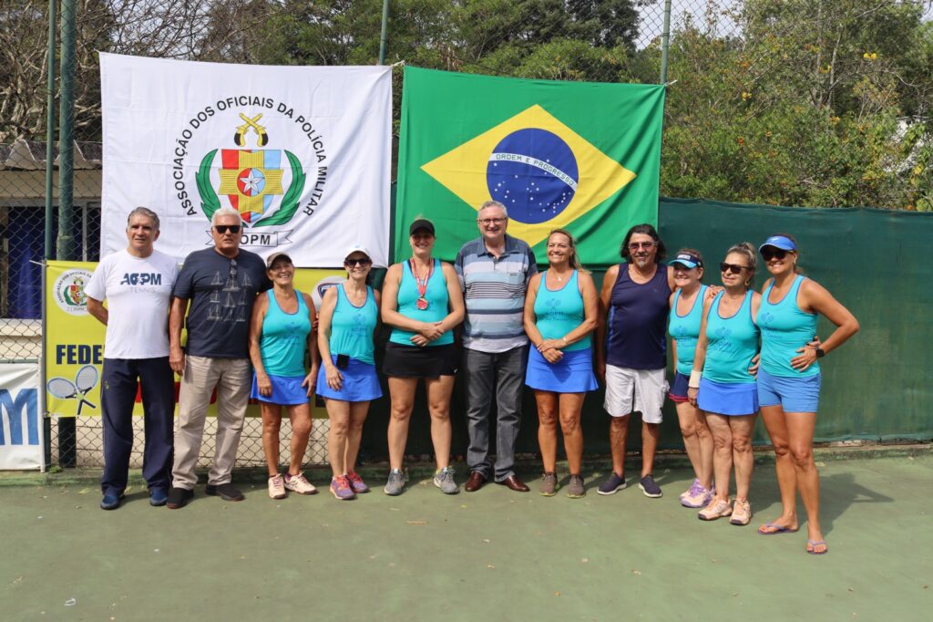 O Presidente da AOPM, Cel PM Flammarion Ruiz, acompanhado pelo vice-presidente Administrativo e Institucional, Cel PM Gerson Lima de Miranda; Diretor de Sede Barro Branco, Cel PM Reynaldo Pinheiro Silva; representando a Diretoria de Esportes, sra Estela Reis; Coronel PM Arlindo e o professor de tênis, sr Joval prestigiaram o evento entregando medalhas as campeãs e vice-campeãs do torneio.