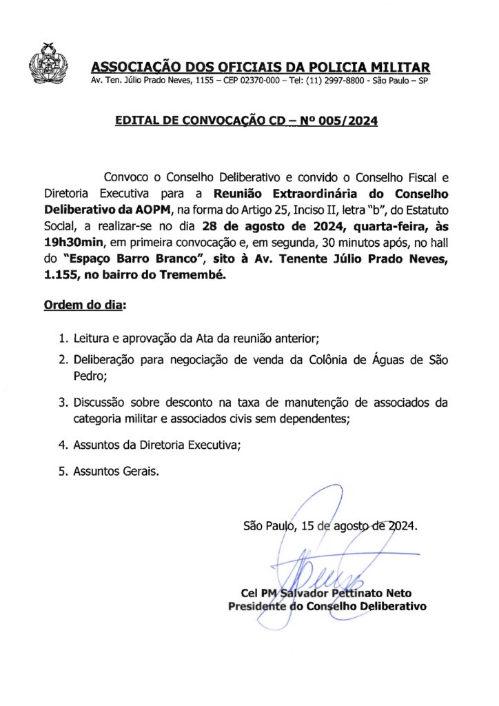 Reunião Extraordinária do Conselho Deliberativo da AOPM, dia 28 de agosto, às 19h30, no hall do Espaço Barro Branco