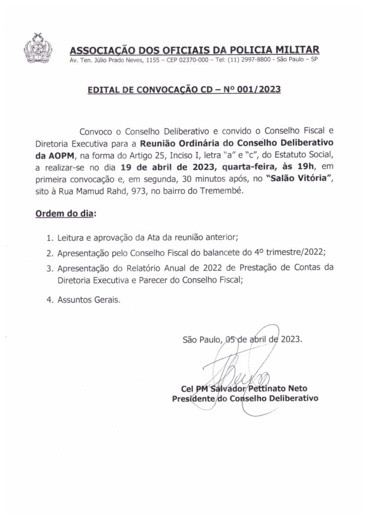 Notícias Institucionais Reunião Ordinária do Conselho Deliberativo da AOPM, dia 27 de novembro, quinta-feira, às 19h, no Salão Vitória