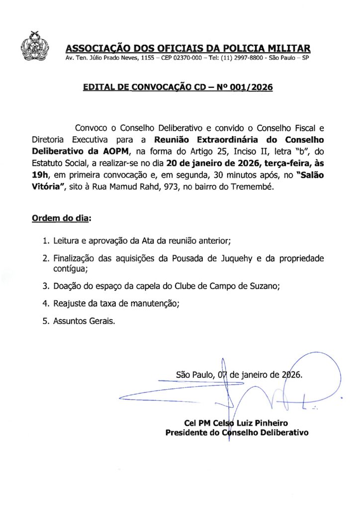 Reunião Extraordinária do Conselho Deliberativo da AOPM, dia 20 de janeiro, terça-feira, às 19h, no Salão Vitória