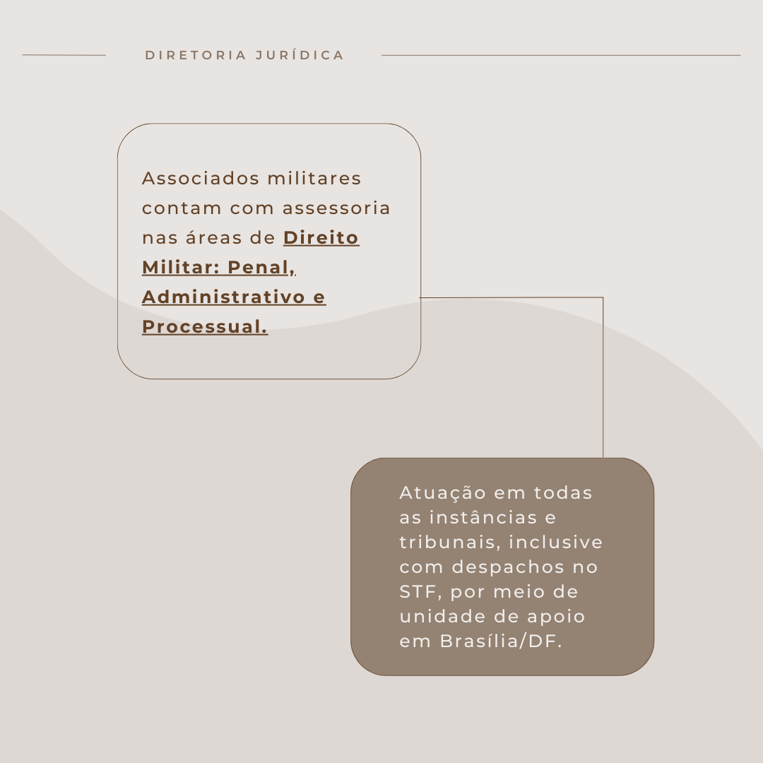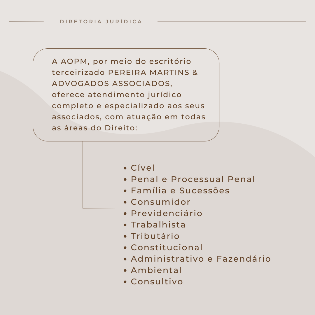 A AOPM dispõe, ainda, aos seus Associados Civis e Militares, do escritório Pereira Martins Advogados e Associados, que presta assistência jurídica nas áreas do direito militar (administrativo e judicial), direito civil, obrigações, família, sucessões, consumidor, ambiental, penal e processual comum, previdenciário, constitucional, trabalhista, tributário, fazendário, administrativo, consultas, mediação e conciliação.
