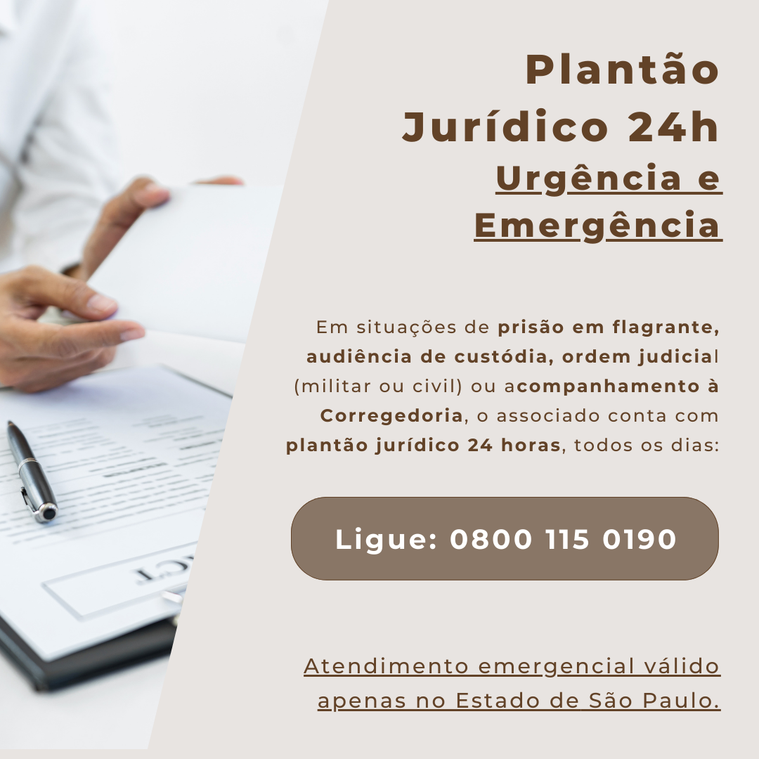 Destaca-se que, em caso de urgência ou emergência, tais como: prisão em flagrante ou de ordem judicial (militar ou civil); audiência de custódia; acompanhamento a corregedoria etc., os associados e/ou seus dependentes, poderão entrar em contato com o escritório Pereira Martins Advogados através do telefone: 08001150190.