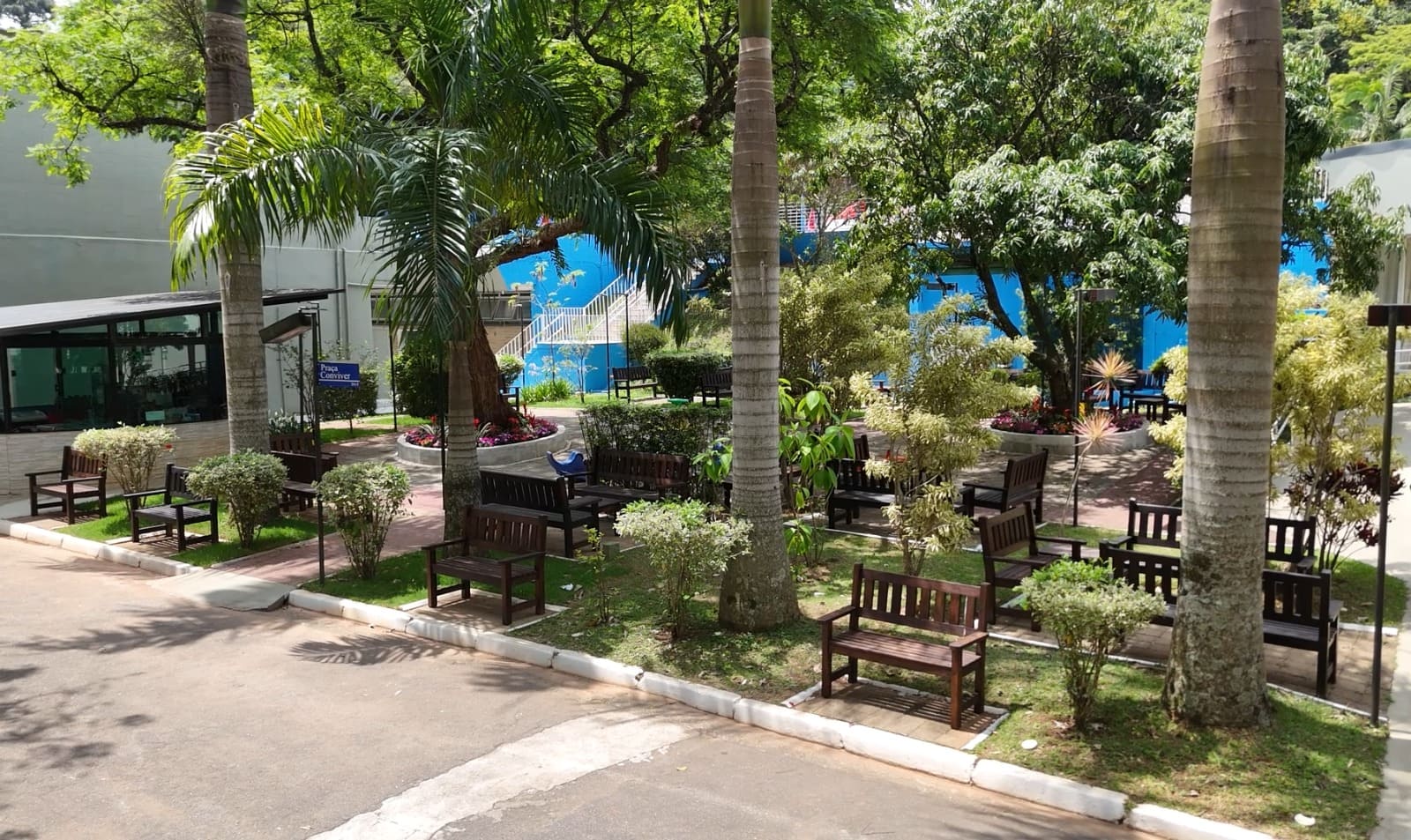 O local possui área de cerca de 500m², conjuntos de bancos e mesas, paisagismo e iluminação especial deixando o espaço ainda mais bonito e aconchegante.